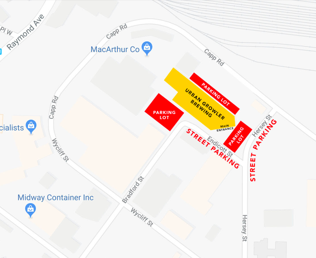 There is no charge to park in the surface parking lot that is accessible via Capp Road. Please see the map below for reference. Various street parking is also available surrounding Urban Growler.